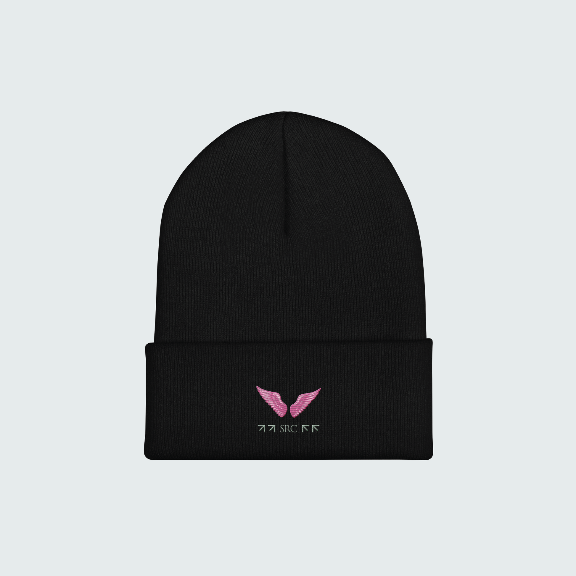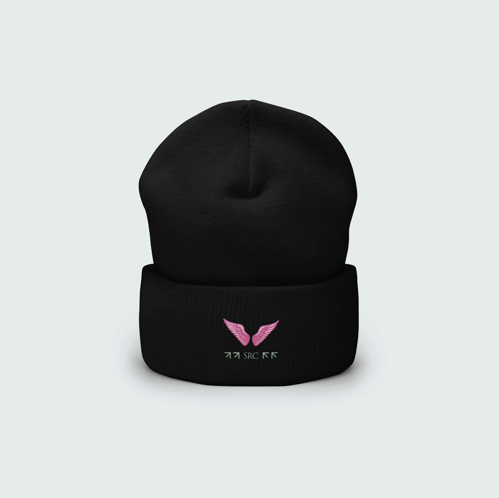This cuffed beanie offers a comfortable, close fit and dependable warmth, making it an essential accessory for everyday wear. Its clean and versatile look pairs effortlessly with streetwear and club inspired outfits. The front features a high quality embroidery that recreates the Cupid wings from the matching t shirt, enriched with the collection’s signature initials SRC. A minimal yet iconic piece that captures the spirit of the Sweet Ravers Club.