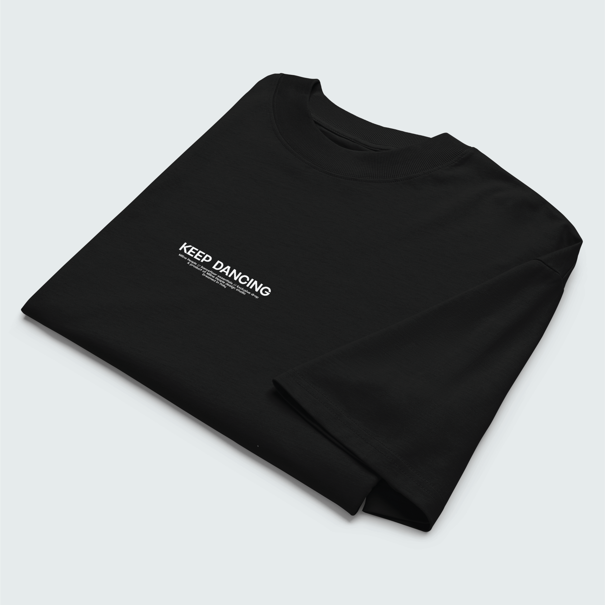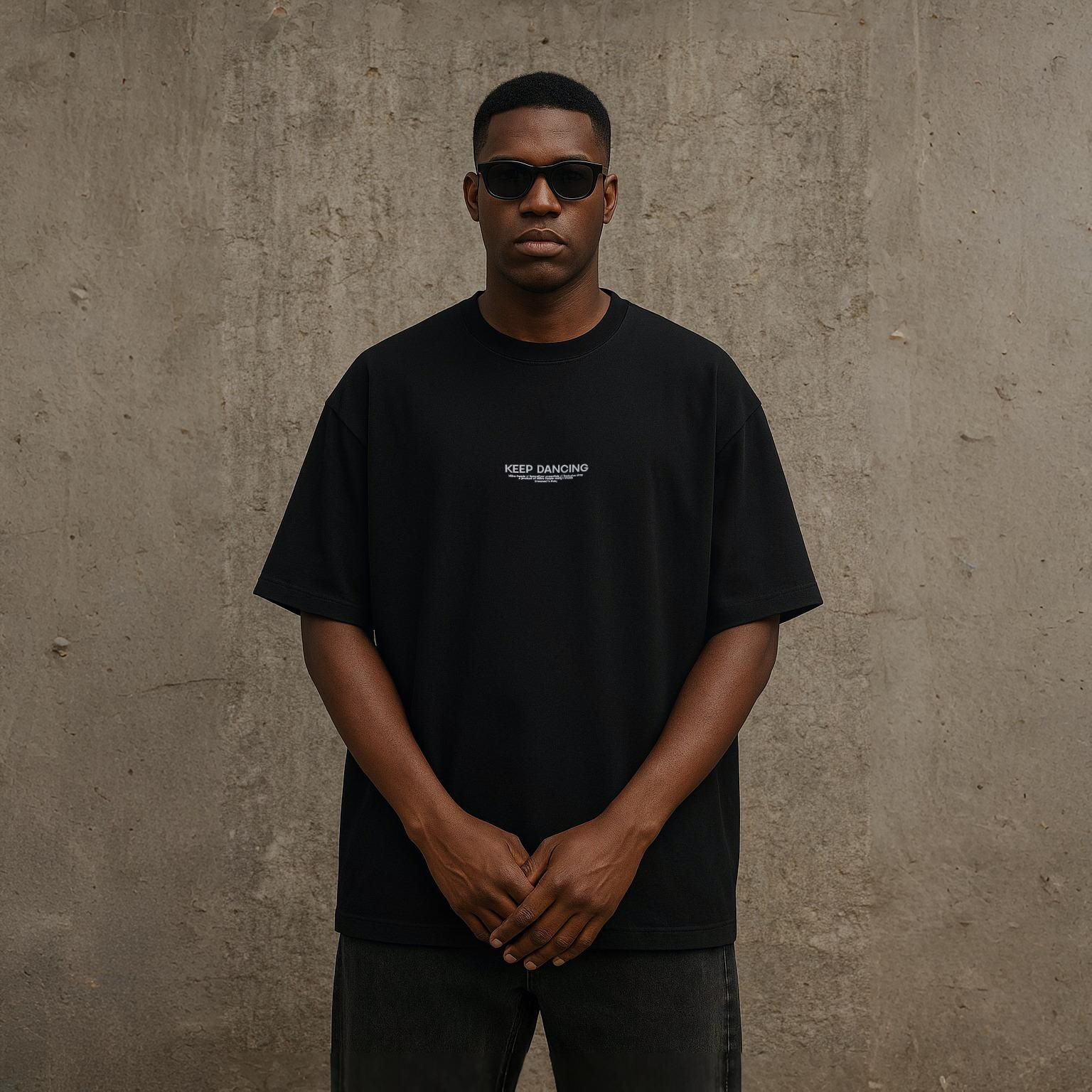 The "KEEP DANCING" t-shirt embodies the pure and raw essence of club culture. Its oversized fit and heavyweight fabric make it perfect for layering, creating a trendy streetwear look. Crafted from 100% organic cotton, this premium t-shirt offers a soft touch and exceptional comfort on the dancefloor. Designed to be minimal and dark, the front features a small lettering that reads "Keep Dancing," complemented by subtle collection details. A true dancefloor essential for those who live for the night.
