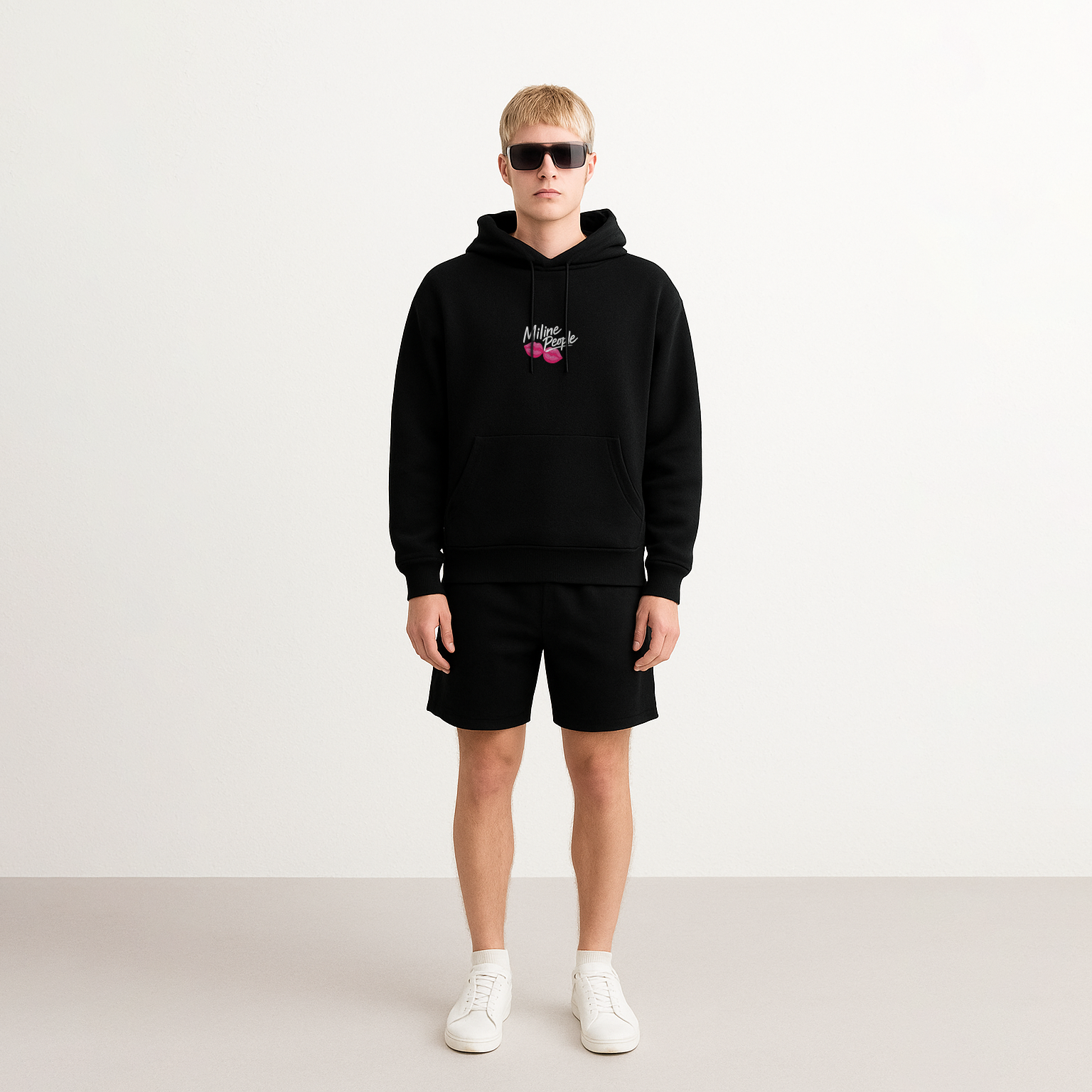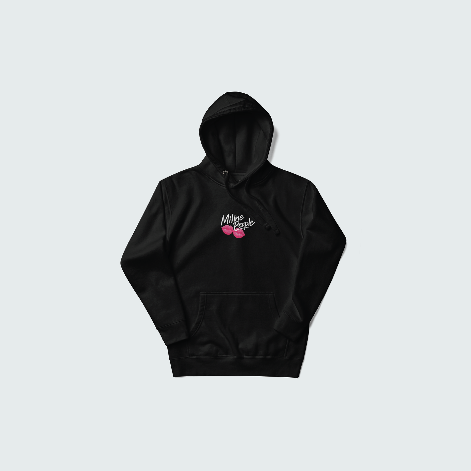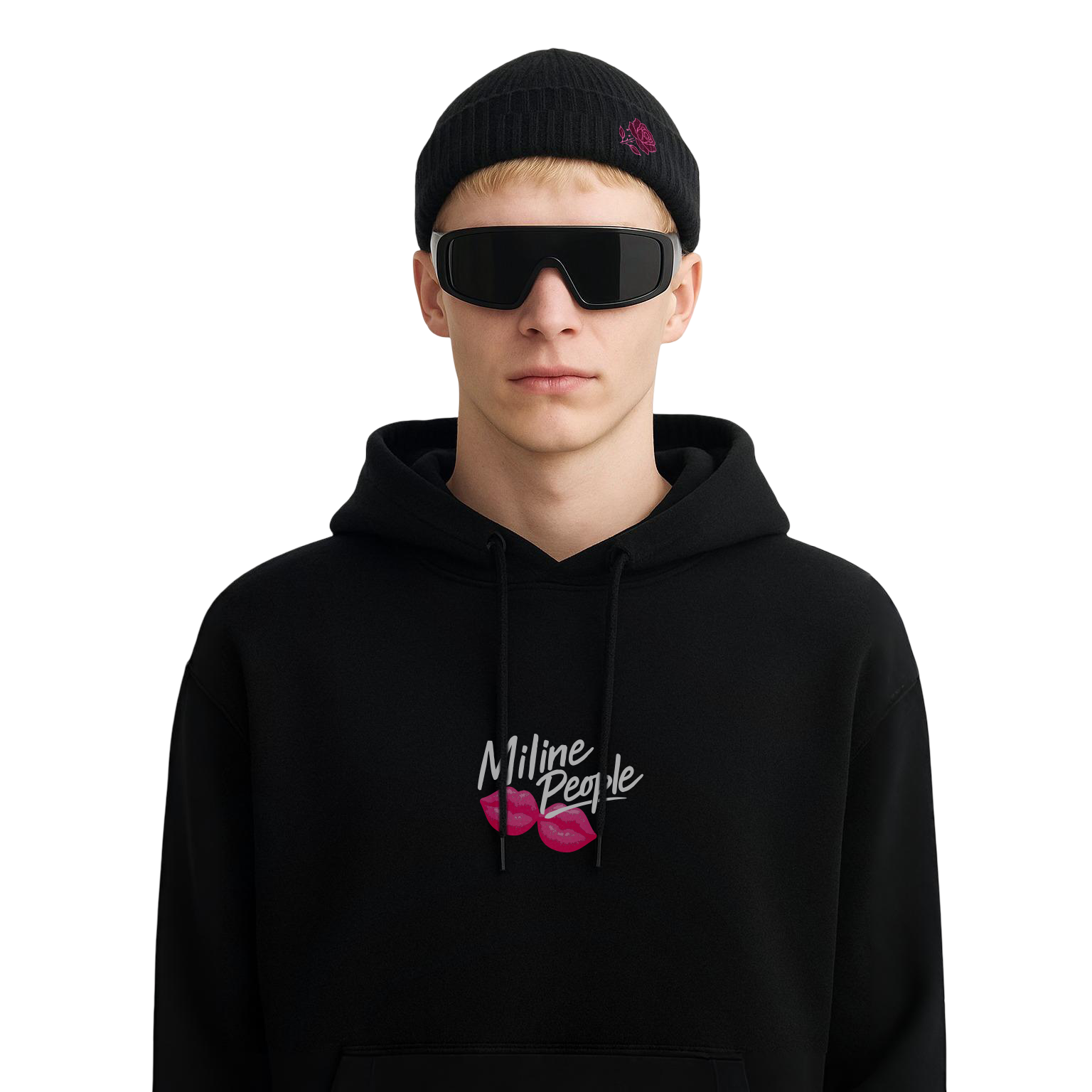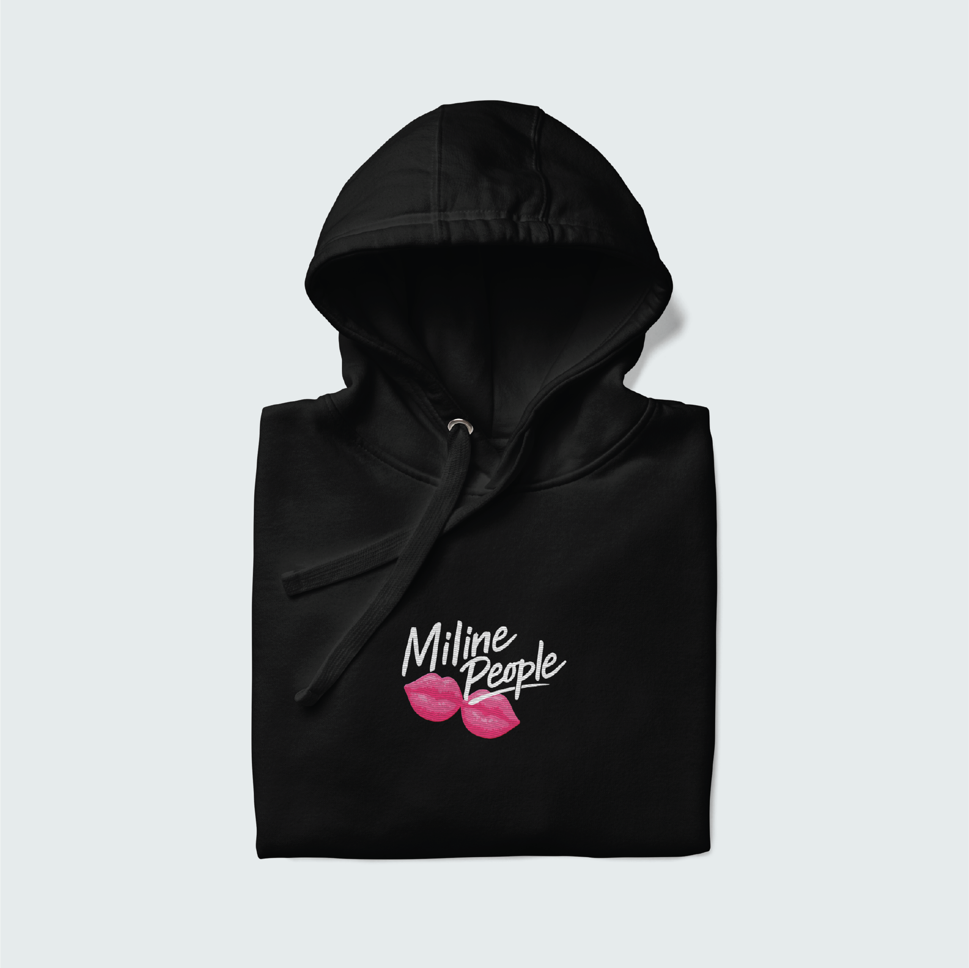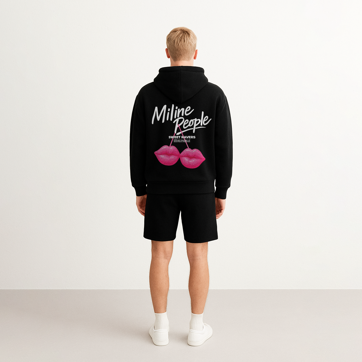 This unisex hooded sweatshirt delivers a classic fit designed for everyday wear, featuring a front pouch pocket and matching flat drawstrings. The exterior in 100% cotton provides a smooth hand feel while maintaining structure and durability. The front showcases a small embroidered detail where the Miline People logo carries a keychain with full lips, a symbol of the freedom found in nightclub nights. The back amplifies the same artwork with the added “Sweet Ravers” lettering, representing the collection it belongs to. A statement piece that blends minimal attitude with the bold identity of the Sweet Ravers aesthetic.